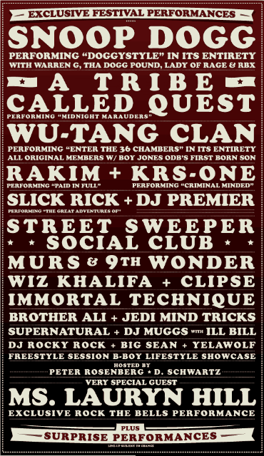 Make sure and come out this saturday and check out Rock The Bells 2010. Located at the NOS Event Center in San Bernardino, CA you better believe its going down rain or shine. With Tons of both new and old artist to rock the stage you better believe this show is going to be sick.